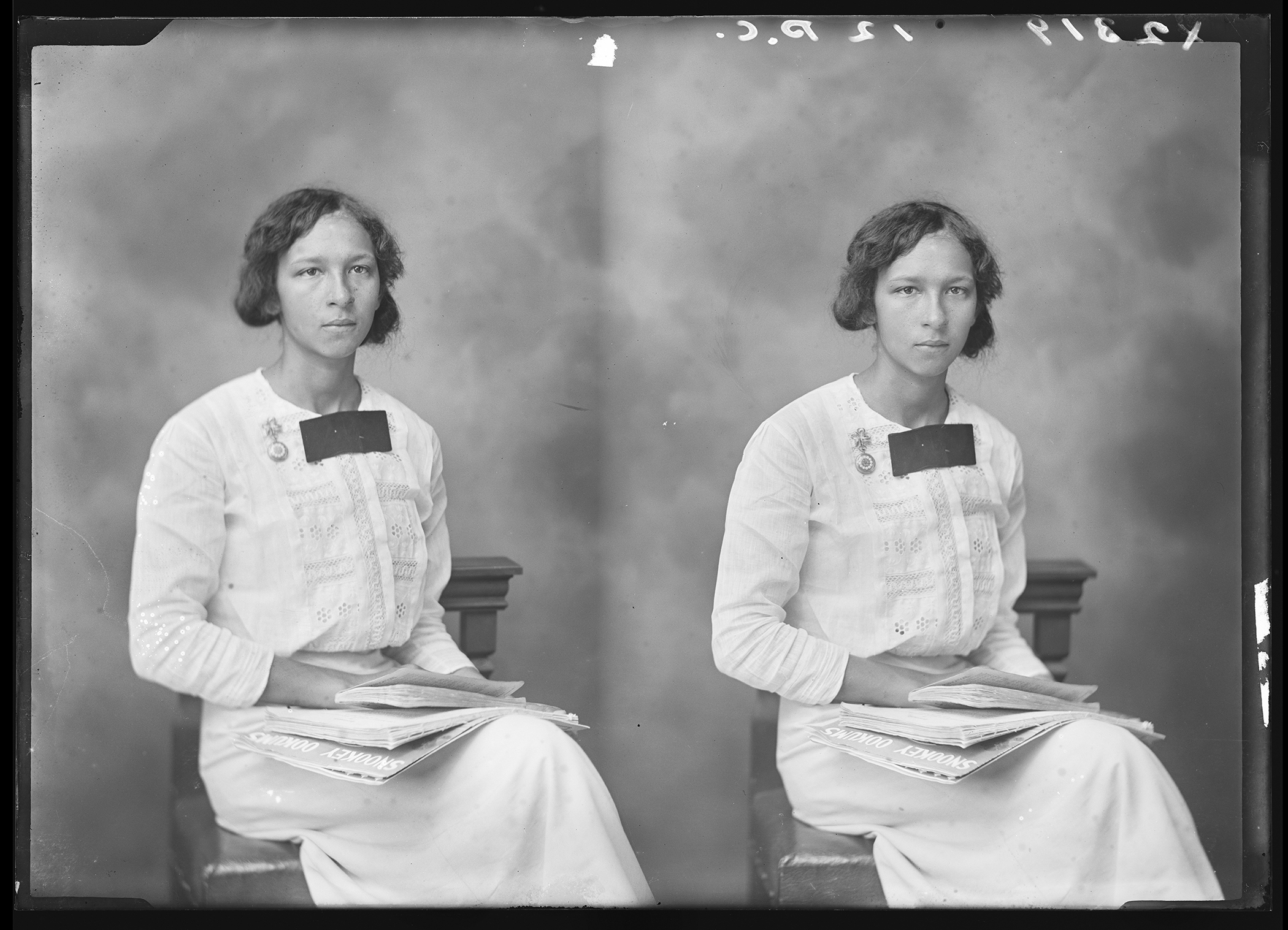 The re-digitized glass plate of Jessie White accessible through Virgo, UVA Library’s catalog system, shows two images of Jessie White, an African American woman, sitting slightly diagonal on a chair with print publications on her lap. Her hair is just below the ears and might be tied back. She wears a full-length white skirt with a white three-quarter length sleeve blouse. The blouse is embroidered with a pin, and a black rectangular shaped bow on toward the collar. Her left gaze is slightly off camera to the right, and the right image holds a more straightforward gaze.