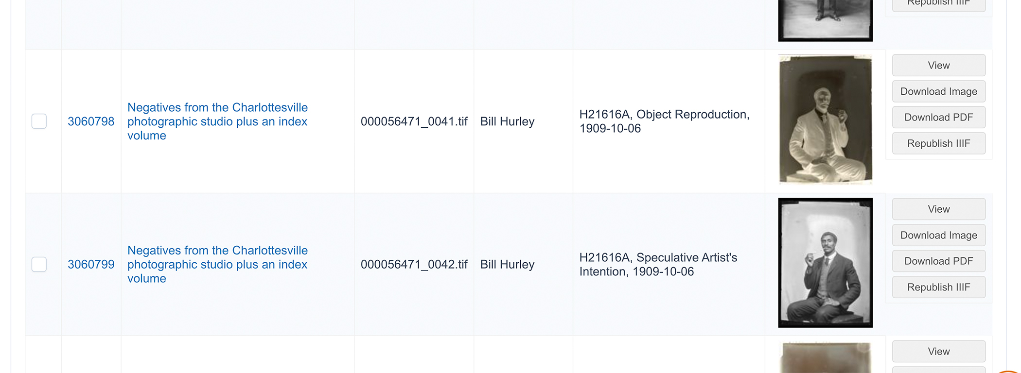 Screenshot Published October 21, 2025 at 2100 × 768 in Re-Digitizing the Holsinger Studio Collection for the 2022 Visions of Progress Exhibition The two preservation formats of the Bill Hurley glass plate negative and associated metadata as shown in the UVA Library’s internal tracking system.